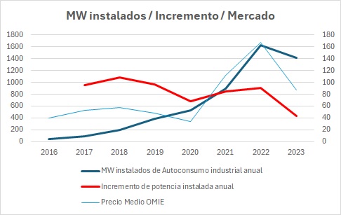 Ocurre que en 2020 el Covid cambia el panorama mundial, se reduce la demanda energética y 2021 se resiente en el precio de la energía. El promedio del OMIE pasa de 33,96 €/MWh en 2020 a 112,93 €/MWh en 2021. Y al inicio de 2022 la guerra de Ucrania provoca una crisis energética que también complica los precios a los que la industria compra la energía, llegando a una media de 167,52 €/MWh con máximos de 700 €/MWh. Ello convierte al autoconsumo en una inversión necesaria para blindarse antes las incertidumbres del mercado energético. Prácticamente se duplica la potencia instalada en 2021, que era de 898 MW en el año, a 1.625 MW en 2022.