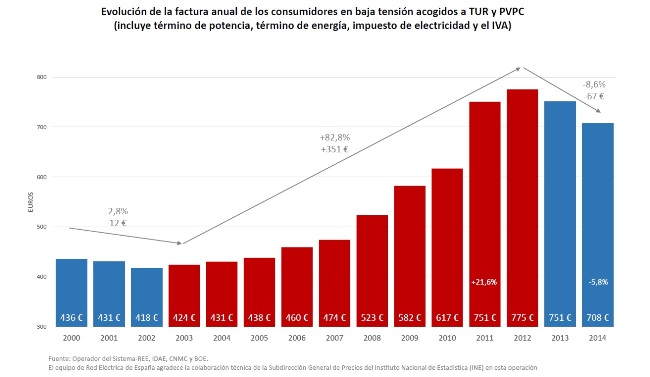 La factura de los consumidores en baja tensión acogidos al nuevo sistema de Precio Voluntario para el Pequeño Consumidor (PVPC) bajó un 5,8% durante el pasado 2014. El importe medio por contrato fue de 708 euros frente a los 751 euros del año anterior. Esta cifra engloba todos los conceptos que integran el recibo de la luz: términos de potencia y energía, impuestos de electricidad e IVA.