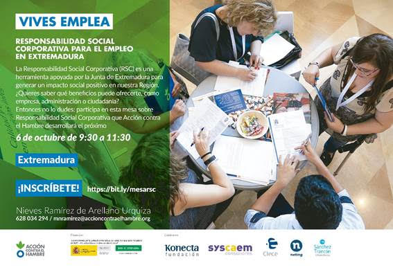En el marco del Proyecto Vives Emplea tenemos el placer de invitarle a la mesa redonda virtual “Responsabilidad Social Corporativa para el Empleo en Extremadura” el próximo martes día 6 de octubre. El encuentro lo organiza la Fundación Acción Contra el Hambre-ACF Spain.
