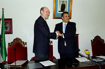 A la firma del acuerdo acudieron el director de Iberdrola Distribución en la Región Centro, Fernando Arronte (a la izquierda de la foto) y al representante de Emdecoria y alcalde del municipio, José Manuel García Ballestero.